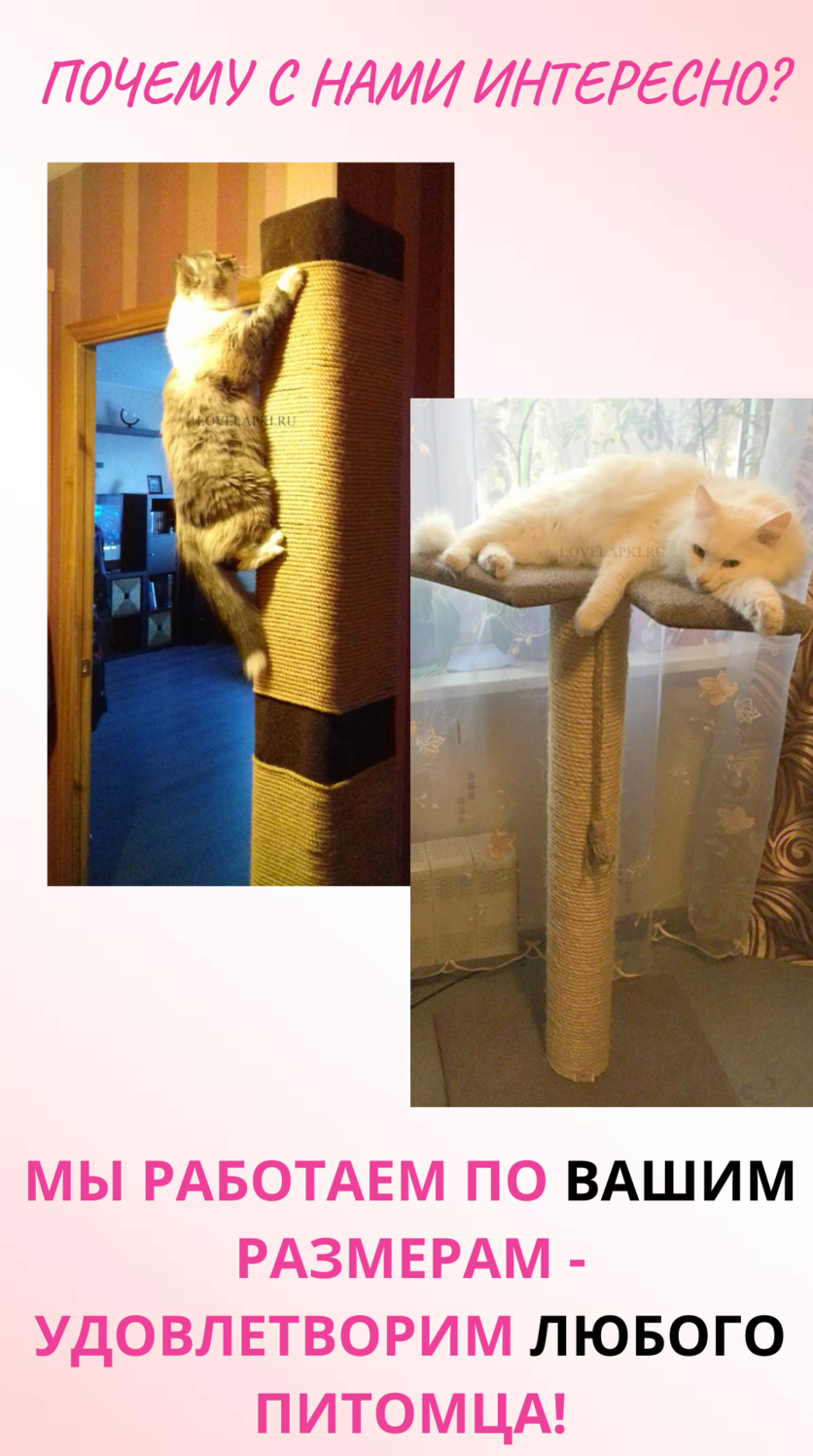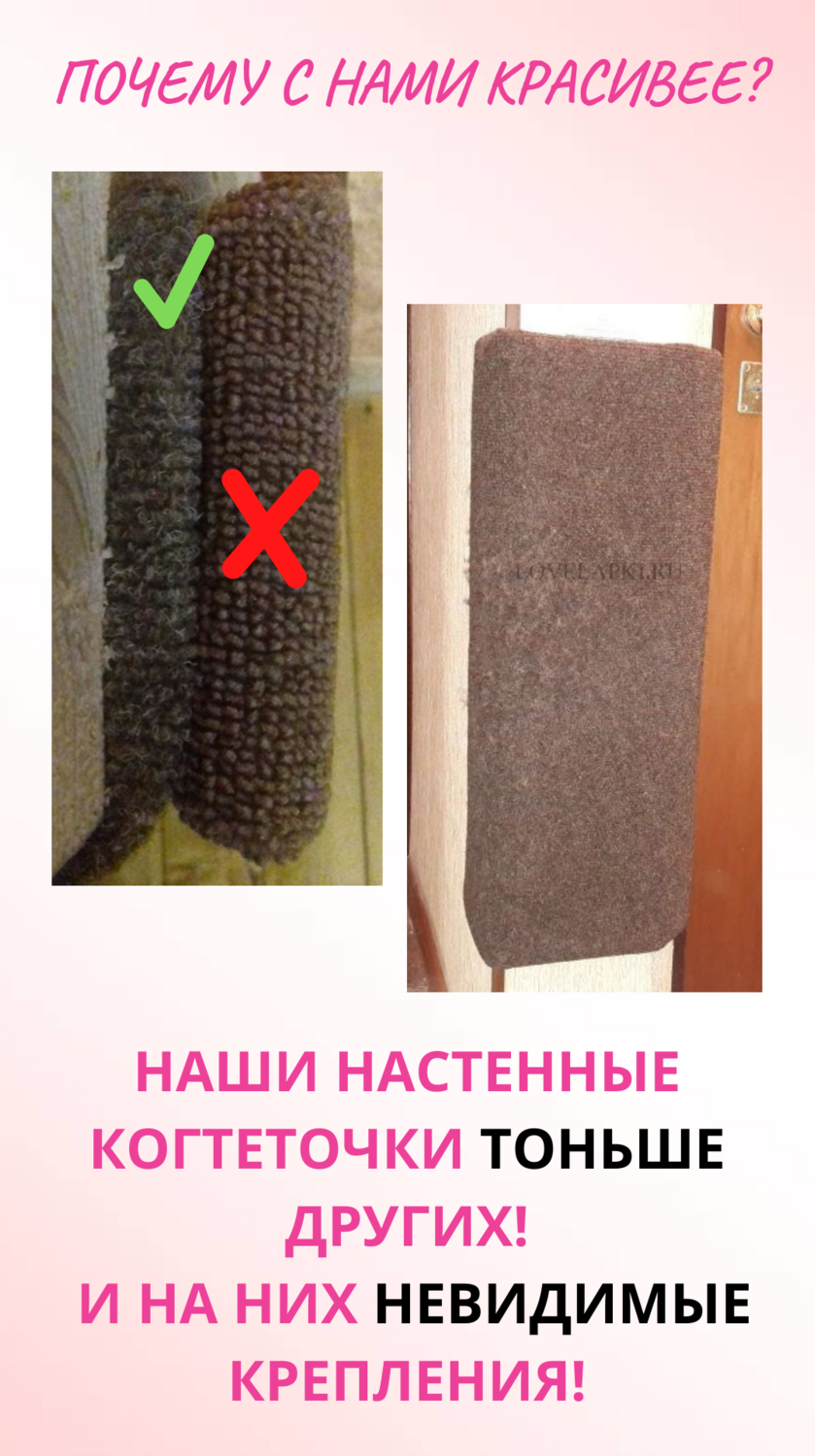 Добрый день! Купили п-образную ,настеную когтеточку!!! Идеальное качество и материалы!!! Замечательно смотрится,т.к. совсем не видно,этих ужасных креплений!!!А главное,что кошка в восторге и постоянно висит на ней,как обезьяна Уже задумываемся о покупке большого комплекса!!! Спасибо большое. Обязательно будем рекомендовать Вас,всем знакомым и друзьям!!!! https://vk.com/topic-131713257_36767255